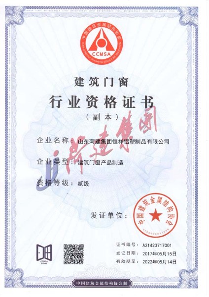 近日,山东菏建集团恒祥铝塑制品有限公司顺利通过建筑门窗行业资质审核,资质等级由三级成功晋升为二级,为我公司在建筑门窗制作行业的发展迈出了坚实的一步。