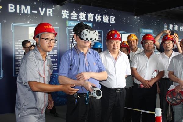 在天香府项目建设现场,观摩团依次参观了“智慧工地体验馆”、“安全体验区”和“智慧工地可视化指挥中心”。期间,集团领导李信强、苗林戴上了“VR”设备,体验了虚拟的场地漫游。