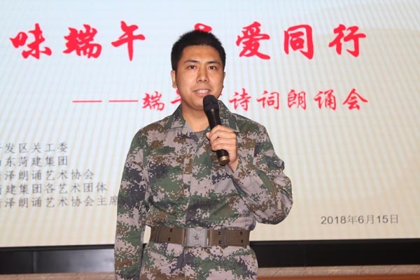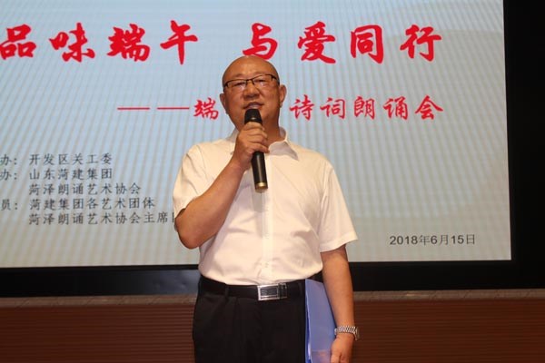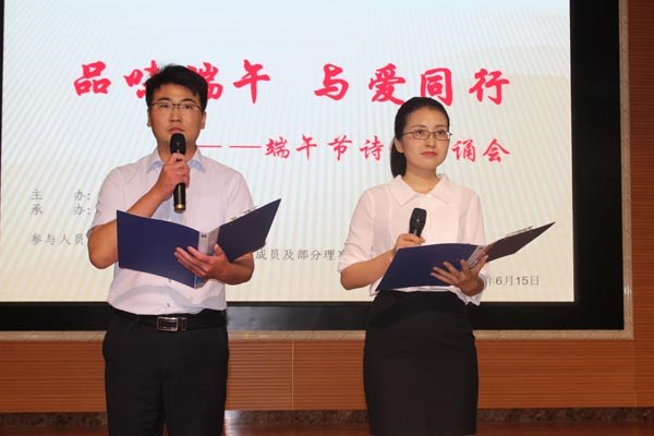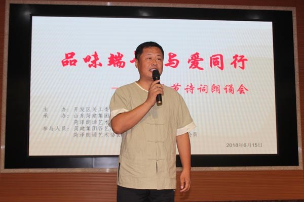 揭牌仪式结束后,菏泽市朗诵艺术家协会联合集团朗诵协会举办了“品爱端午与爱同行”诗词朗诵会。市朗诵艺术协会周忠良、赵巨声、李东娟、徐茵、辛云霞、苑蕾、瞿晓妍等著名艺术家登台表演,集团党委副书记任永信及职工李霞、孔令阳、张涛、王会敏、汲艳玲等与艺术家同台演出,《红梅唤春》《苏轼:水调歌头》《如梦令》《宣州谢朓楼饯别校书叔云》《名著里的端午节》等一首首或古代、或现代、或优美、或深沉的中华经典诗文、现代诗歌和个人原创作品,通过满怀深情的朗诵表达出来,倾情抒发着自己对祖国的情感,对中华悠久文化的赞美。