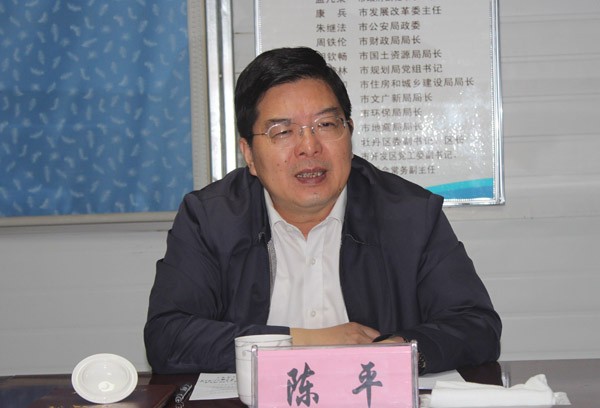 集团党委书记、董事长李信强(左一)向陈平市长汇报项目情况