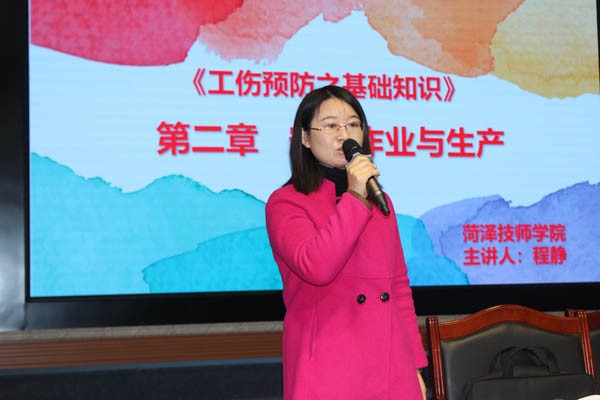 菏泽技师学院高级讲师程静从安全色与安全标志、劳动防护用品、触电工伤事故与预防、机械伤害与预防、火灾与爆炸、施工现场案例分析等六个部分,并结合生产生活实际,为大家进行了生动形象的讲解,深入浅出、让人受益颇深。