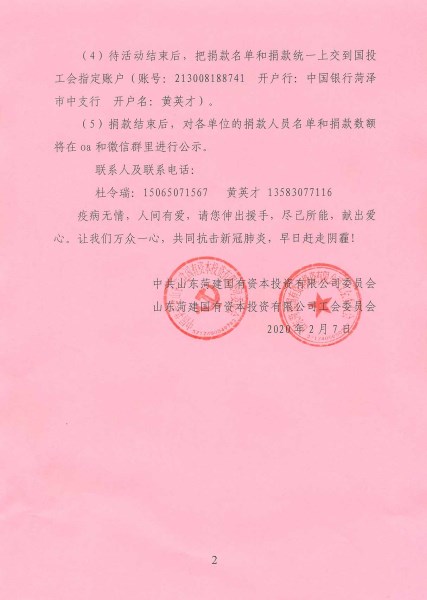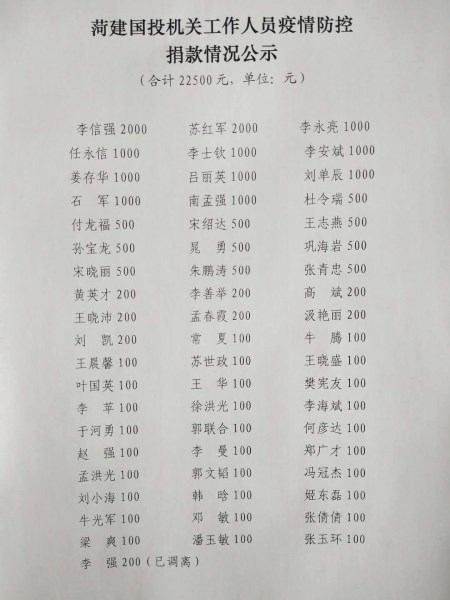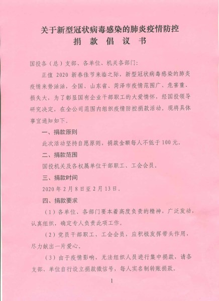 在捐款期间,公司党委书记、董事长李信强,党委副书记、总经理苏红军,第一时间带头各自捐款2000元,在职工中起到了表率作用。之后,一幕幕感人至深的场景,时时触动每一位员工的心。随后,公司将把这份饱含全体干部职工深情的爱心捐款,转至菏泽市慈善总会账户,统一调剂,用于支援全市各级各部门抗击新型冠状病毒感染的肺炎疫情。