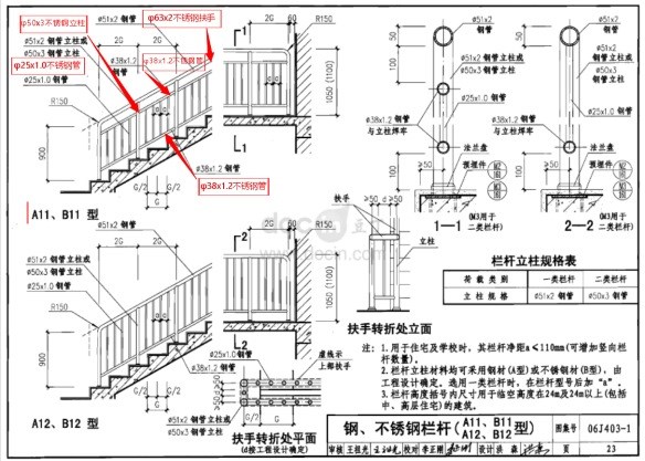 室内选用国标图集06j403-1中P23页A11B11型,部分不锈钢管以红色标注为准,其余按图集施工,详附图。栏杆高度满足图纸及规范要求,出完成面部分均为不锈钢构件。满足设计规范、图集及施工验收规范要求。构件厚度要求满足要求。 |