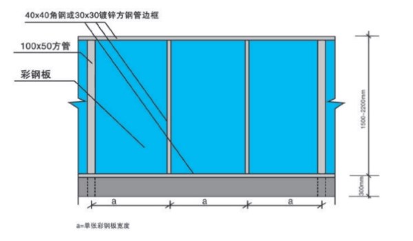 3)围挡边框及横撑采用30*30*1.2镀锌方钢管,其中竖向边框间隔为1米;