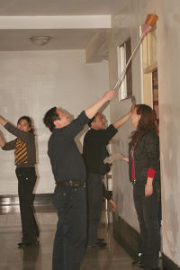 为使庆“五一”迎“五四”活动丰富多彩,二OO九年四月二十八日上午,菏建集团工会、团委和集团机关党支部组织机关人员近四十人,集中进行了擦洗办公楼内墙壁义务劳动。