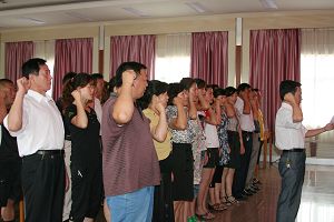 6月30日上午,集团在六楼会议室举行庆祝建党89周年重温入党誓词宣誓活动。在神圣而又庄严的仪式上,党委副书记郭武代表集团党委在讲话中指出,入党宣誓是神圣的、非常有意义的活动,体现了入党的庄重性和严肃性。他希望全体党员要时刻牢记党的誓言,积极履行党员义务,严格要求自己,做一名合格的共产党员,在各自岗位上扎实工作、无私奉献,积极为企业的又好又快做出应有贡献。随后,在党委办公室主任韩明的领读下,部分单位党支部书记、机关党员代表和09年度预备党员共40余人,面对鲜红党旗,郑重举起右手,进行了入党宣誓,重温入党誓词。