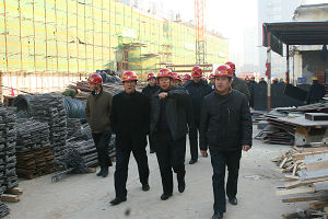 每到一处,张总带领全体人员深入施工现场,顶着凛冽寒风,代表集团党委对元旦期间坚守岗位的管理人员和施工人员祝以新年的祝福,并先后听取110应急中心、景岸家园和赵王河新村工程负责人关于工程概况、质量、安全、进度等方面的情况介绍,听取甲方和监理的意见。在座谈会上,张广周总经理要求全体参建人员在冬季施工中要确保安全零事故、质量零缺陷,强调110应急中心要确保“鲁班奖”和完成“4.30”目标,加大配合、协调、沟通力度,确保各阶段高标准、高效率、高效益地完成既定目标。