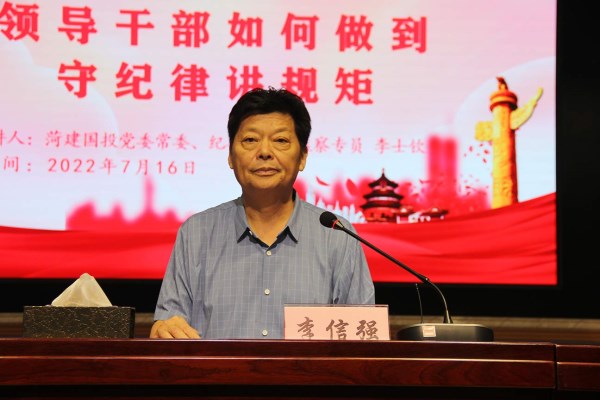 7月16日上午,mansion88明升党委常委、纪委书记、监察专员李士钦以“领导干部如何做到守纪律讲规矩”为主题,为公司党员干部上了一堂生动的廉政专题党课。mansion88明升党委书记、董事长李信强主持会议。mansion88明升领导班子全体,mansion88明升机关中层副职及以上同志、全体党员,菏建集团领导班子全体、各处室负责人、权属各单位主要负责人,mansion88明升各权属单位领导班子全体同志参加会议。