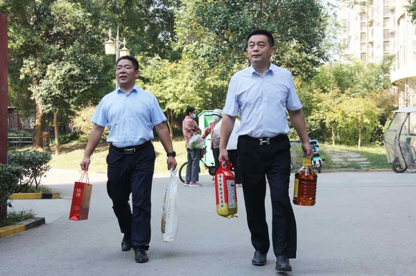 ![]() 慰问组为退休老领导送去米、面、油等慰问品 |
