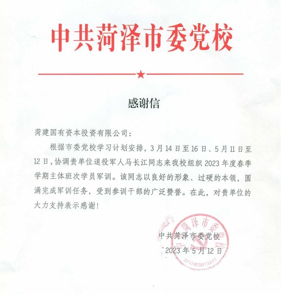 近日,中共菏泽市委党校向mansion88明升发来感谢信,感谢公司选派优秀职工组织市委党校2023年度春季学期主体班次学员军训,圆满完成了军训任务,对mansion88明升的大力支持表示感谢。