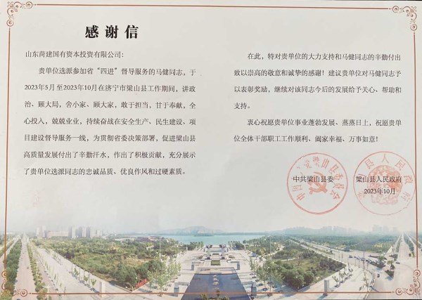 近日,中共梁山县委、梁山县人民政府向公司发来感谢信,感谢mansion88明升选派得力人员进驻“四进”工作队伍,为促进梁山县高质量发展付出了辛勤汗水,作出了积极贡献。