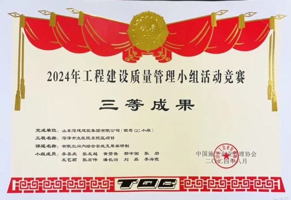 近日,中国施工企业管理协会主办的2024 年(第二届)工程建设行业群众性质量活动高质量发展大会在太原召开,菏建集团提交的两项QC成果经激烈角逐,最终在全国1565项成果中脱颖而出,其中《提高架空石材施工一次合格率》获2024年工程建设质量管理小组活动竞赛一等成果,《有限空间内综合管线支吊架研制》获2024年工程建设质量管理小组活动竞赛三等成果。