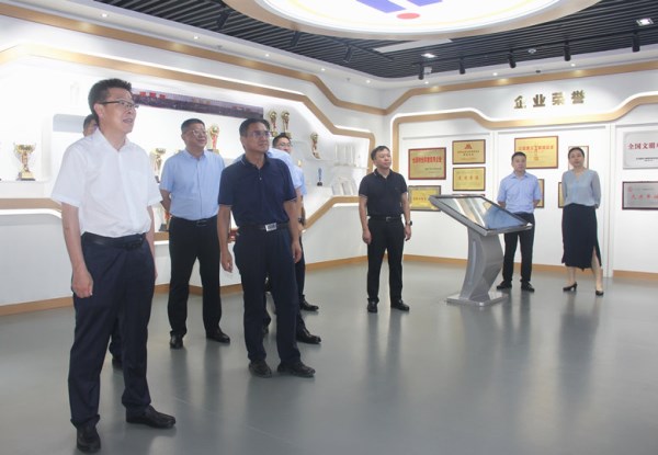 青岛银行党委书记、董事长景在伦(左一)一行参观菏建企业文化展厅