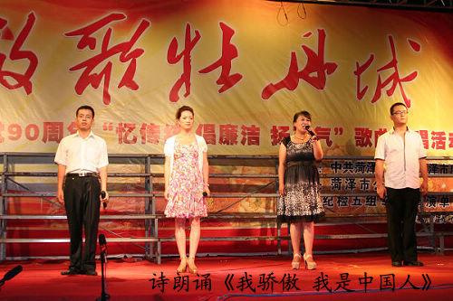 为纪念建党90周年,6月28日晚,我公司参加了在大剧院广场举行的“放歌牡丹城”——庆祝建党90周年“忆传统、倡廉洁、扬正气”歌曲传唱活动。本活动由市纪委和市监察局主办,我公司任永信、王建华、李霞、赵善淼、孟艳丽、侯仰书参加了本次活动,表现出了菏建集团良好的精神面貌,受到了观众的高度赞扬。