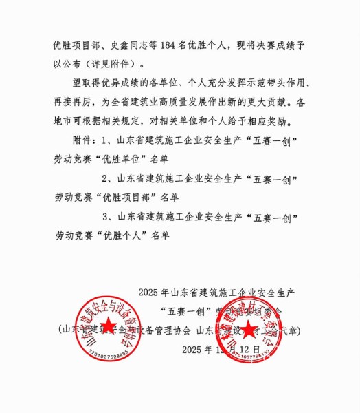 12月,山东省建筑安全与设备管理协会、山东省建设建材工会联合发布《关于公布2025年山东省建筑施工企业安全生产“五赛一创”劳动竞赛决赛成绩的通知》,东方樾府A区二标段项目凭借扎实的安全管理基础和卓越的竞赛表现,荣获“优胜项目部”称号。