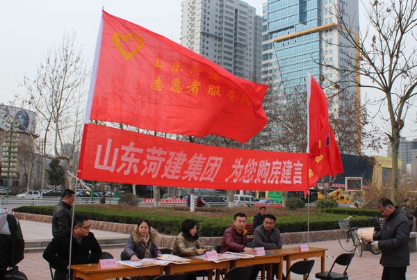 此次活动,集团以“山东菏建集团为您购房建言”为主要内容,共展开涉及“购房咨询、装饰咨询、房屋质量咨询、法律咨询”等多个方面知识宣传。三月的花都还是冷风刺骨,集团志愿者以专业的态度积极向过往的行人讲解房屋相关知识,尽心尽力做好服务阐述雷锋时代精神,用实际行动展示出菏建人良好的社会形象。